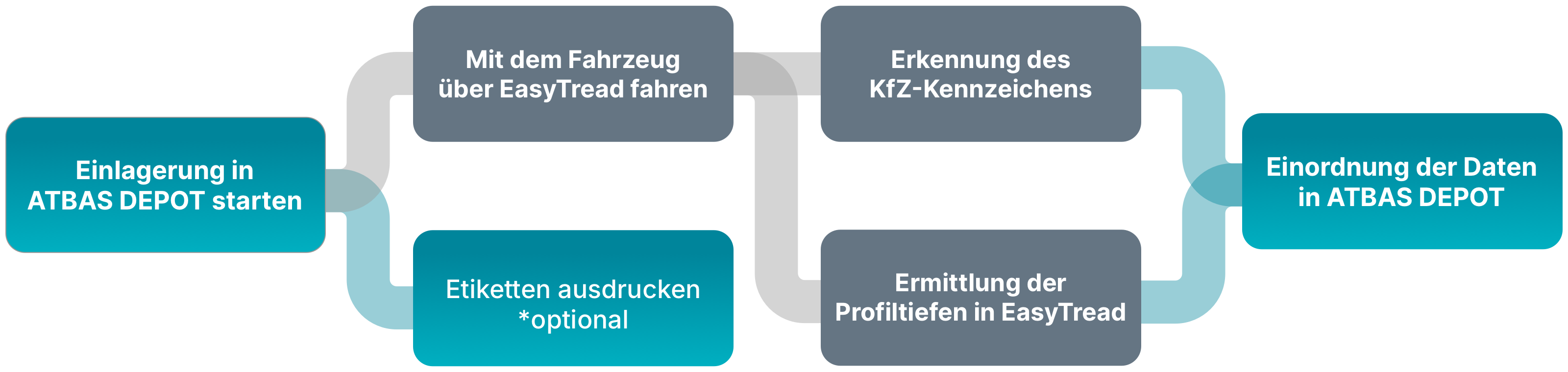 Starten Sie die Einlagerung in ATBAS DEPOT, dabei können Sie bereits Etiketten ausdrucken. EasyTread erkennt das Fahrzeug und die Profiltiefen auf der Bühne. Die Daten werden dabei automatisch an ATBAS DEPOT übertragen.