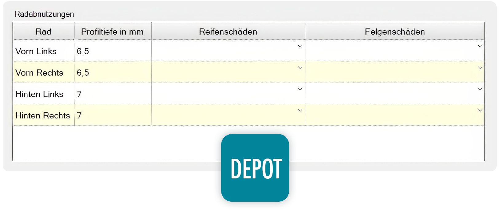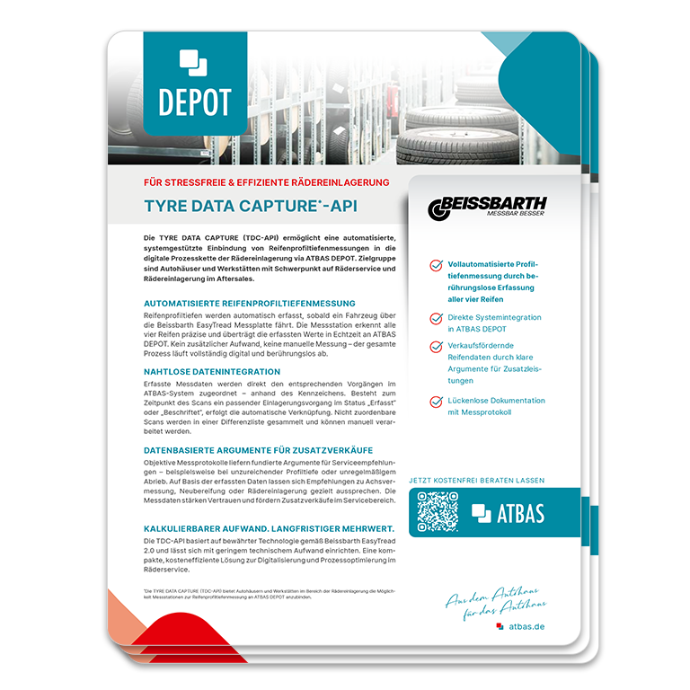 Die Verknüpfung zwischen ATBAS DEPOT und EasyTread ermöglicht einen schnelleren und bequemeren Prozess zur Einlagerung. Damit sparen Sie wertvolle Zeit bei der automatischen Übertragung und Zuordnung von Profiltiefen in DEPOT und sind bedeutend flexibler bei der Erfassung und Übernahme aller wichtigen Daten.